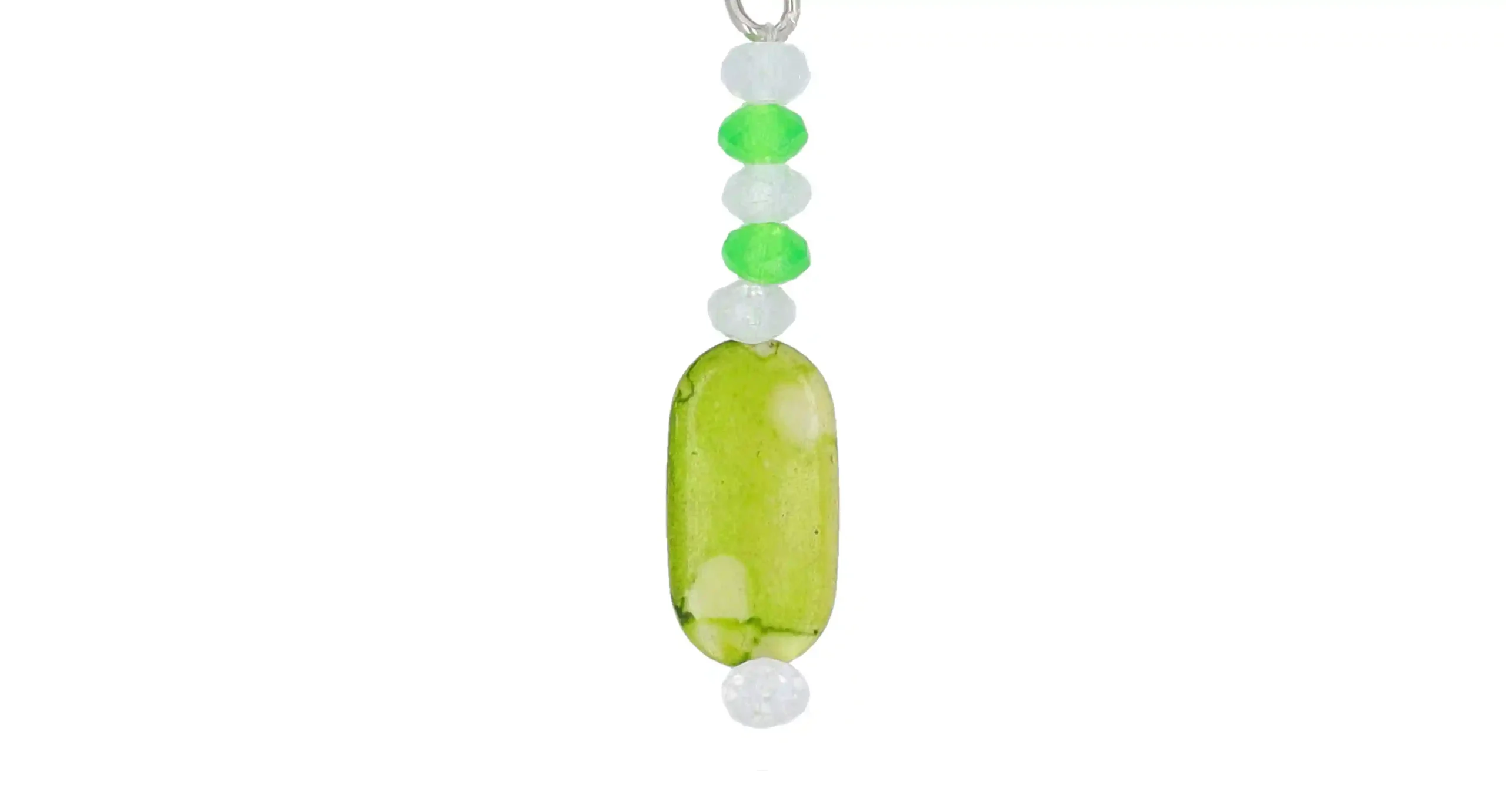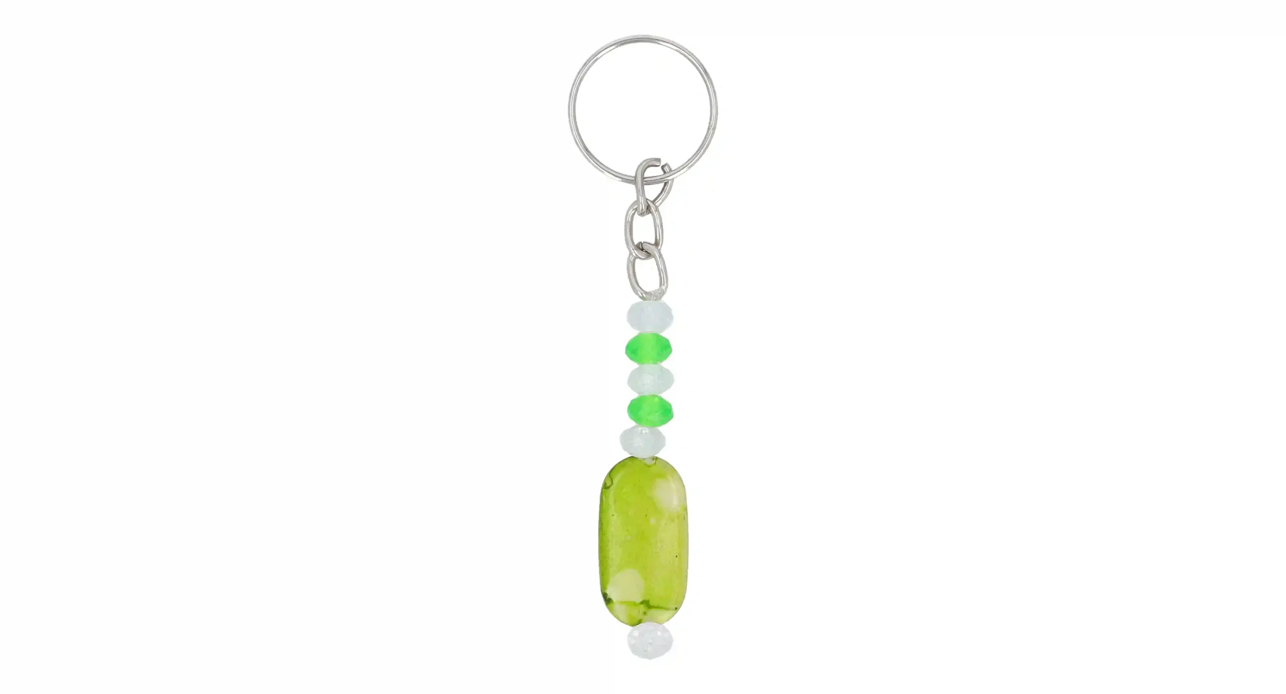 Shine bright with the Citrus Burst Keychain. This keychain features a mix of [mention materials, e.g., faceted glass and crystal] beads in refreshing shades of lime green and crystal clear. The [mention focal bead description, e.g., smooth, rounded glass] bead adds a unique focal point.