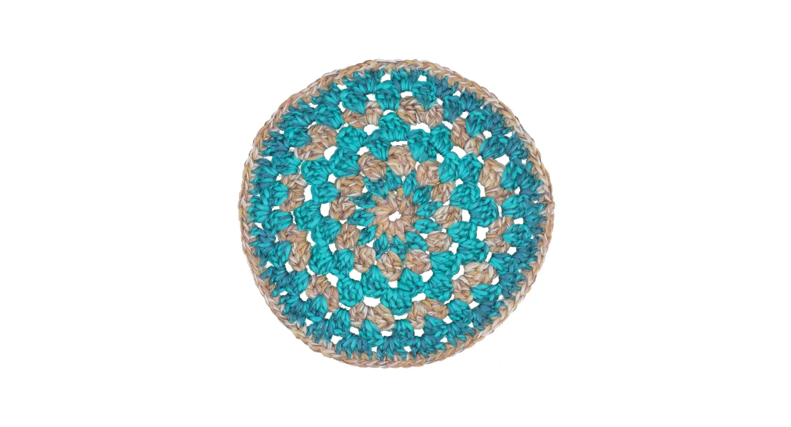 Add a splash of serenity to your space with the Ocean Breeze Coaster. This handcrafted circular crochet coaster showcases vibrant teal and earthy beige hues, reminiscent of the tranquil meeting of sea and sand. Perfect for protecting your surfaces while enhancing your decor, this versatile piece is ideal for mugs, vases, or small planters.